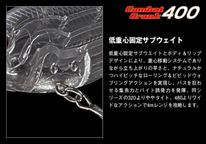 Az Evergreen Combat Crank 400 a japán precizitás és innováció mesterműve. A felúszó típusnak köszönhetően könnyedén vezethető az akadályokkal teli vizekben, hiszen a bevontatás megállítása után lassan felemelkedik, így elkerülhetők az elakadások. Merülési mélysége, 3,2-4,0 méter, tökéletes választássá teszi a mélyebb mederviszonyok, törések és a vízi növényzet szélén tartózkodó ragadozók megcélzására. A 6,8 cm-es hossz és 21 grammos tömeg ideális arányt biztosít a távoli és pontos dobásokhoz, miközben ellenállhatatlan mozgással ingerli a halakat.