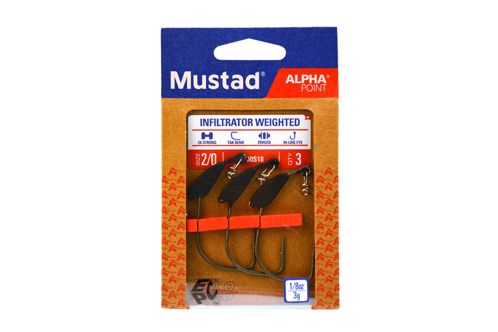 A Mustad Infiltrator Weighted 5gr 4/0 súlyozott offset horog innovatív kialakításának köszönhetően forradalmasítja a lágycsalis pergetést.